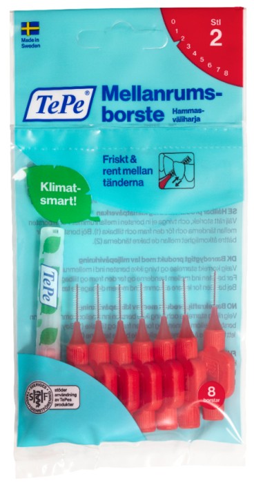 TePe Mellanrumsborste bör användas regelbundet för att borsta mellan tänderna, där vanlig tandborste inte kommer åt. Kan även användas vid brokonstruktioner, implantat och tandställning. TePe Mellanrumsborste har en plastbelagd tråd och strån av högsta kvalitet för effektiv och skonsam rengöring.
