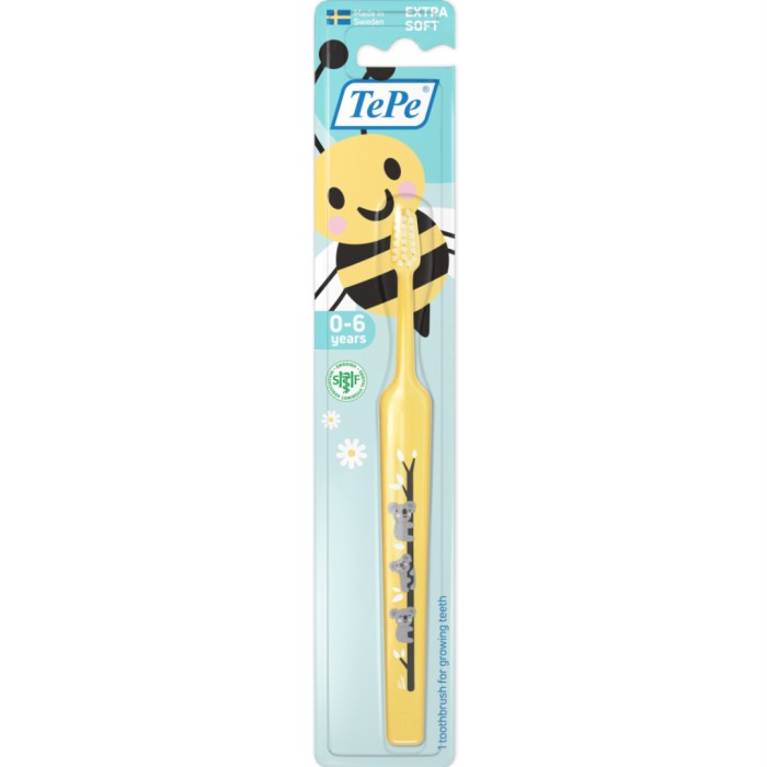 TePe Mini är en tandborste för barn och har ett mindre borsthuvud och kortare borst med mjuka eller extra mjuka strån. Tandborstskaftet är bekvämt att hålla i både för barn och vuxna.