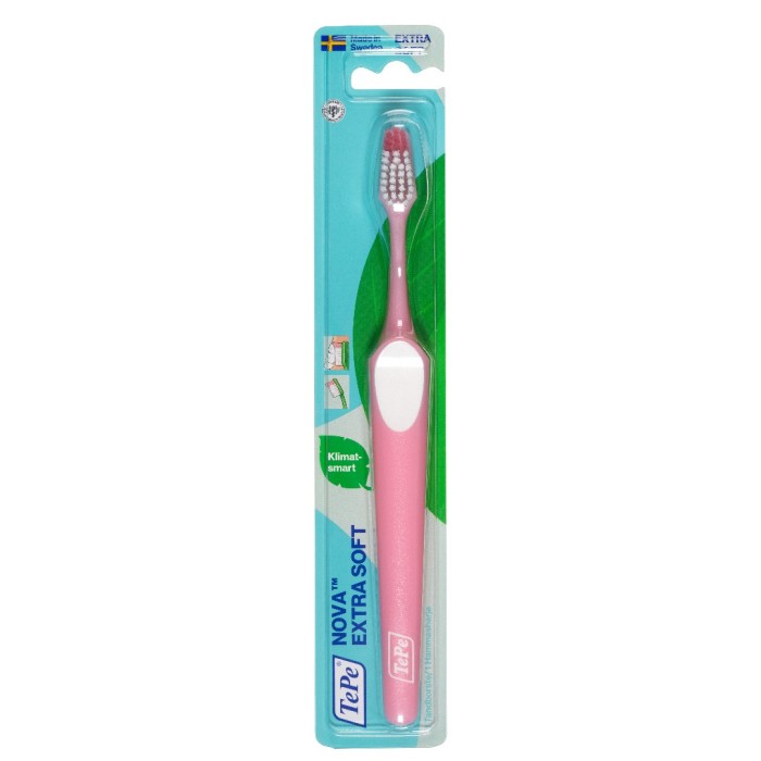 TePe Nova™ Extra Soft är en tandborste med ett avsmalnande borsthuvud och en tipp för bättre åtkomlighet, speciellt effektiv runt de bakre tänderna och för andra ytor som är svåra att nå. Borststråna är topprundade för att rengöra skonsamt.