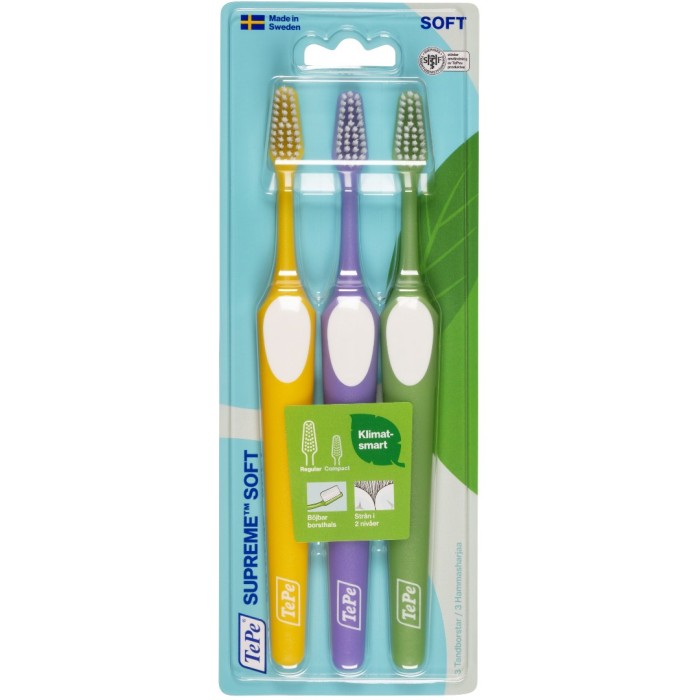TePe Supreme Soft är tandborstar med borststrån i två nivåer för att ge en bättre åtkomlighet. De långa borststråna når längre in mellan tänderna och rengör längs med tandköttskanten, och de kortare stråna rengör resten av tandytan. Tandborsten har ett avsmalnande huvud för att du lättare ska komma åt även svåråtkomliga ytor, och ett greppvänligt handtag med tumgrepp.