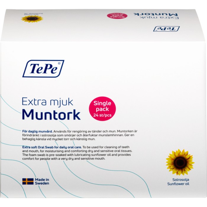 TePe Extra mjuk muntork Smörjande kan användas för daglig munvård och för att bevara och förbättra munhälsan. Kan användas så ofta som behövs för att rengöra munnen, ta bort stelnad saliv och matrester. Muntorken är förindränkt i solrosolja som ger en smörjande och återfuktande känsla vid torr mun och känslig munslemhinna. Oljan har inga tillsatta smaker eller tillsatser.