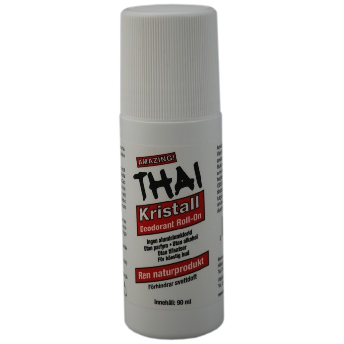 Thai Kristall Deodorant är en roll-on som består huvudsakligen av mineralsaltet alun (Potassium Alum eller Amonium Alun) som på ett effektivt sätt tar hand om dålig lukt i armhålan vid svettning. Deodoranten täpper inte till porerna och hindrar inte kroppens naturliga andning. Alun absorberas ej av huden.