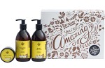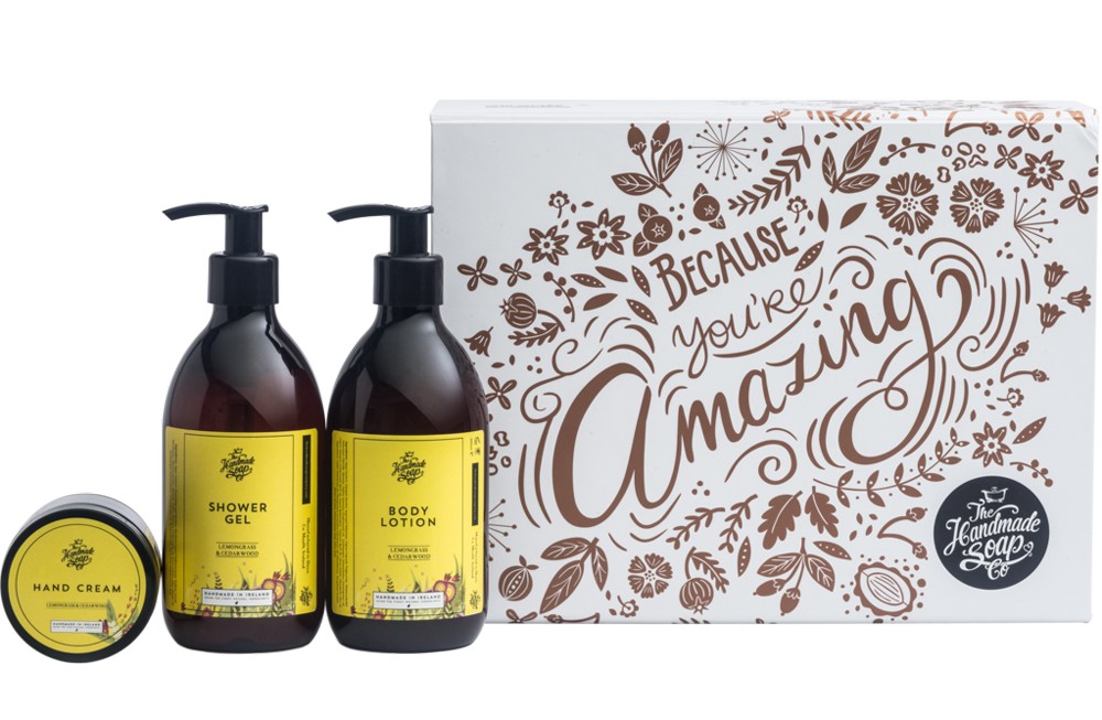 Vacker presentask från irländska The Handmade Soap Co med duschgel, bodylotion och handkräm.