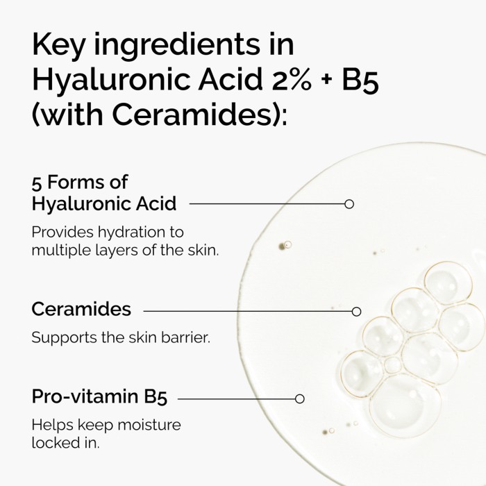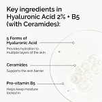 Denna formulering innehåller 5 former av hyaluronsyra, som hjälper till att ge fukt till flera lager av hudens yta. Hyaluronsyra är ett fuktighetsbevarande ämne som finns naturligt i huden där det binder till sig vatten. De former som ingår är molekyler med låg, medelhög och hög molekylvikt, en HA-krospolymer och hydrolyserad HA.