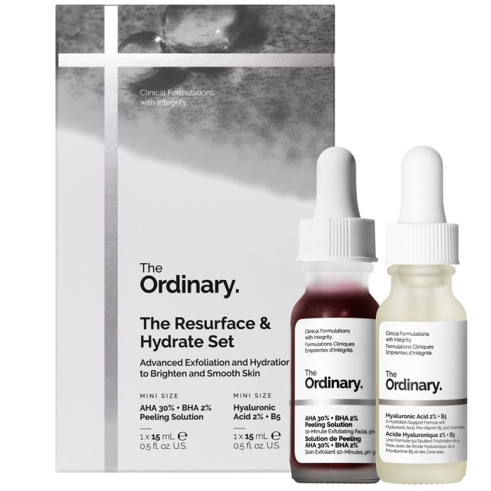 Resurface & Hydrating Duo från The Ordinary innehåller en kombination produkter för en uppfräschad och återfuktad hud. Setet innehåller miniatyrstorlekar av två kraftfulla produkter: AHA 30% + BHA 2% Peeling Solution (15 ml) och Hyaluronic Acid 2% + B5 (15 ml)