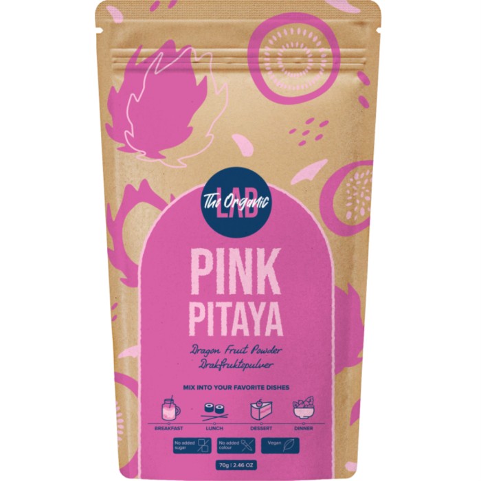 The Organic Lab Pink Pitaya är ett pulver gjort på frukten Pink Pitaya (drakfrukt). Pulvret kan du blanda i smoothies, i bakelser eller i olika maträtter för att få till en fantastisk djupt rosa färg. Det piggar upp på tallriken när du gör t ex gröt eller pannkakor. Pulvret ligger i en påse som är återvinningsbar som papper.