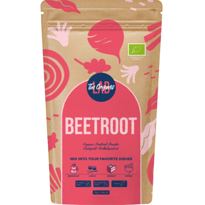 The Organic Lab Rödbetspulver är ett ekologiskt pulver gjort på rödbetor noga utvalda för bästa kvalitet. Rödbetan är rik på vitaminer och andra näringsämnen, och pulvret kan blandas i smoothies, eller användas i bakelser och maträtter för att ge en klar röd färg samtidigt som det tillför vitaminer.