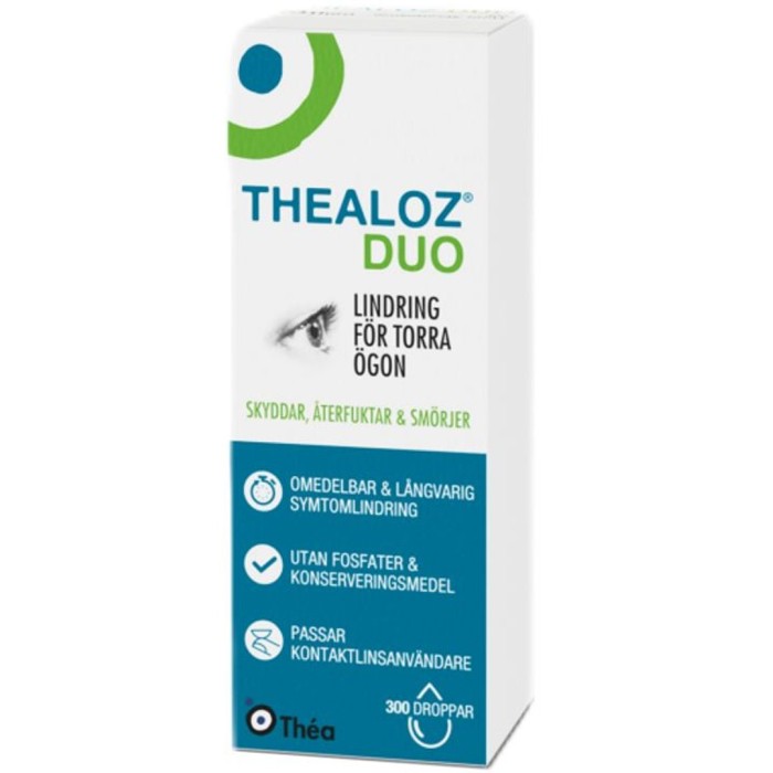 Thealoz Duo ögondroppar behandlar torra ögon. Dropparna ger långvarig lindring genom två naturliga molekyler: trehalos och hyaluronsyra. Trehalos skyddar hornhinnans celler mot uttorkning och hyaluronsyra återfuktar och smörjer och ger långvarig lindring.