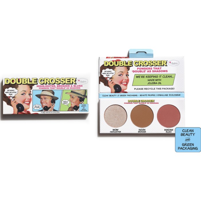 theBalm Double Crosser är en ansiktspalett med en highlighter i champagneguld, en neutral matt bronzer och en rosigt mauvefärgad rouge. Formuleringarna innehåller lugnande växtingredienser som jojobaolja och druvkärneolja.