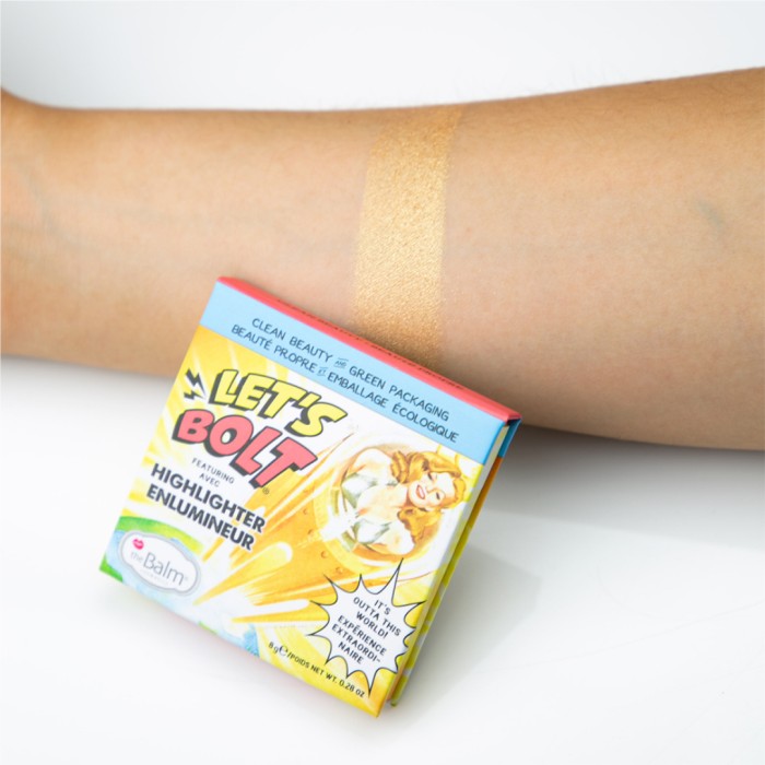 Let's Bolt Highlighter från theBalm är highlighter med skimmer och skugga som ger huden lyster med en mjuk guldglans. Kan byggas upp från ljus till klar utan att se glittrig eller blank ut. Let's Bolt innehåller botaniska ingredienser som förstärker hudens naturliga lyster. Applicera på kinderna, näsan och ögonlocken för att ge huden lyster.