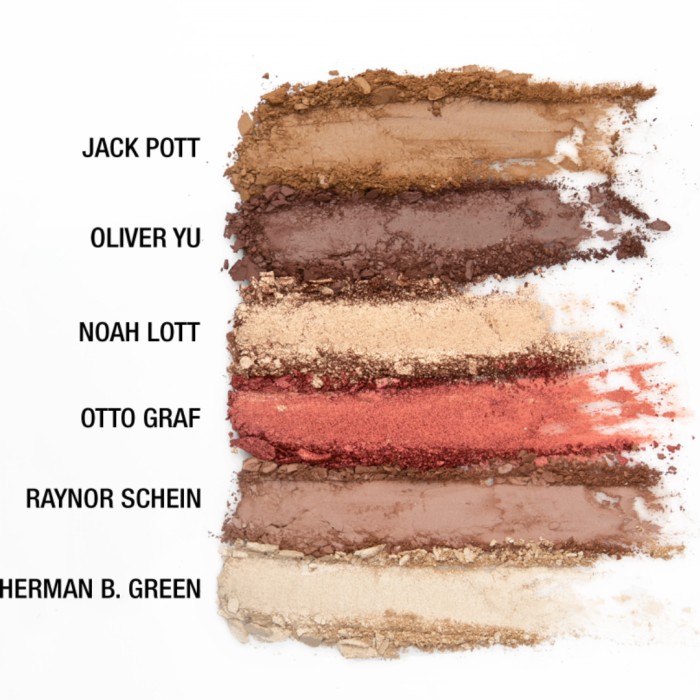 Jack Pott, Oliver Yu, Noah Lott, Raynor Schein Ingredients: Mica, Zinc Stearate, Octyldodecyl Stearoyl Stearate, Lauroyl Lysine, Boron Nitride, Kaolin, Sodium Dehydroacetate, Simmondsia Chinensis (Jojoba) Seed Oil, Tocopherol, Vitis Vinifera (Grape) Seed Oil, Carthamus Tinctorius (Safflower) Seed Oil, Cera Carnauba ((Copernicia Cerifera (Carnauba) Wax) Cire De Carnauba), Rosmarinus Officinalis (Rosemary) Leaf Extract, Tocopheryl Acetate. May Contain / Peut Contenir [+/ Titanium Dioxide (Ci 77891), Iron Oxides (Ci 77491, Ci 77492, Ci 77499), Manganese Violet (Ci 77742), Ultramarines (Ci 77007), Red 7 Lake (Ci 16035)]