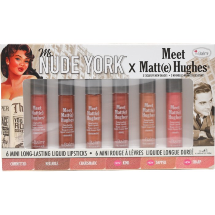 theBalm Miss Nude York Meet Matte Hughes Mini Lip Stick Kit är en kollektion med 6 st nudefärgade flytande läppstift i miniformat. Ett format som passar perfekt att ha i fickan.