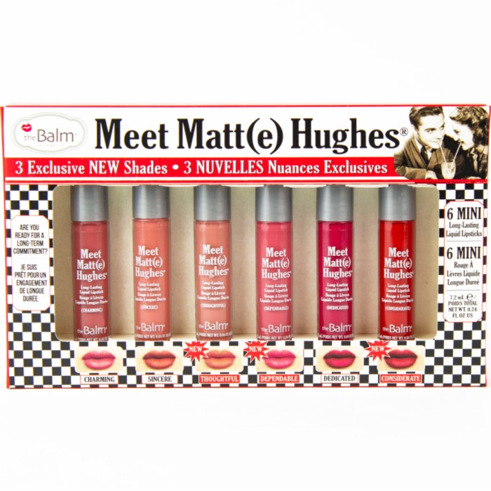 theBalm Meet Matte Hughes Mini Lip Stick Kit nr 14 är ett kit med 6 st flytande läppstift i miniformat. Kitet innehåller nyanserna Charming, Sincere, Thoughtful, Dependable, Dedicated, och Considerate.