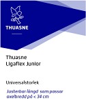 Ligaflex Junior är en immobiliserande och stödjande axelortos för barn som brutit nyckelbenet. Stödet består av en bekväm skumgummidyna som fästs dorsalt med mjuka axelremmar. Remmarna kan klippas av och ortosen kan på så sätt anpassas efter barnets storlek. Thuasne Ligaflex kan tvättas i 30 grader skonsam tvätt.