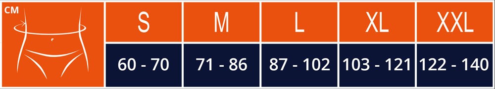 För att välja rätt storlek, mät omkretsen runt midjan. Se bild för storlekstabell.