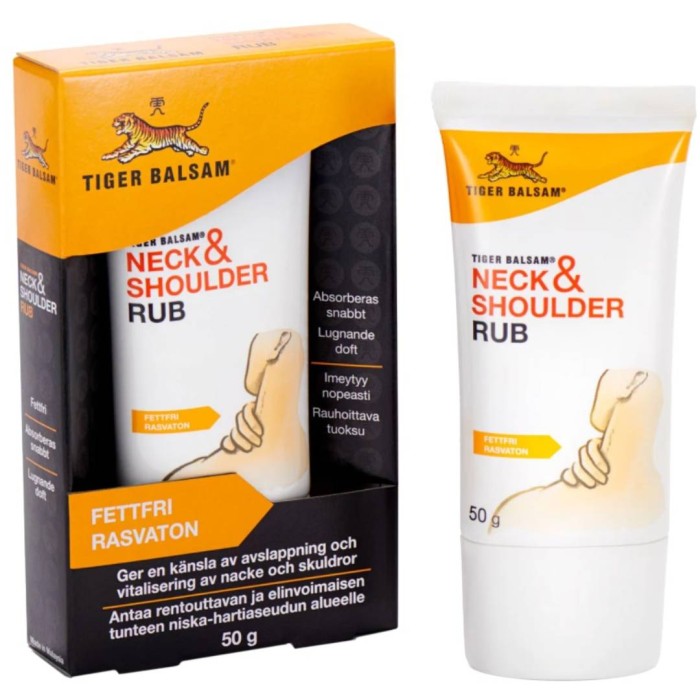 Tiger Balsam Neck & Shoulder Rub är en avslappnande kräm för nacke och skuldror. Massage i samband med applicering av krämen hjälper musklerna att slappna av.