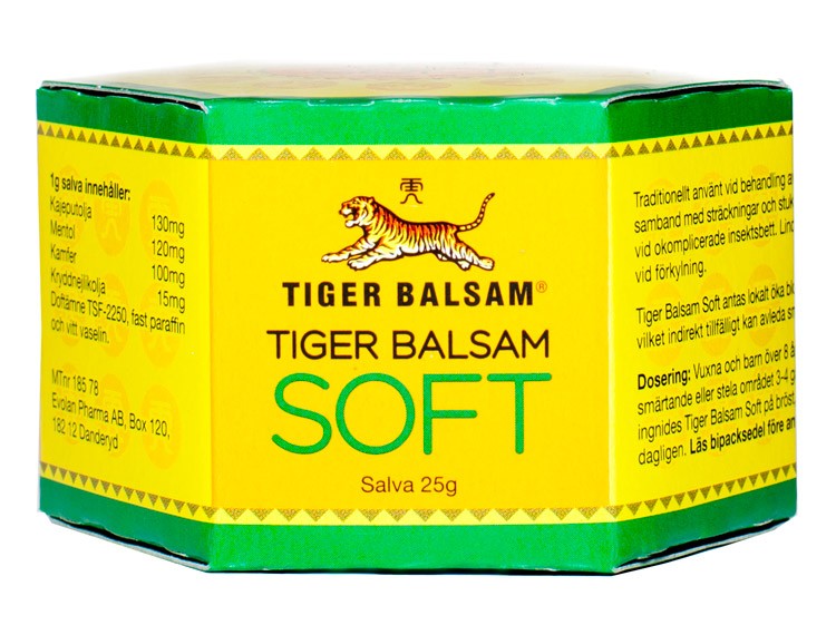 Vuxna och barn över 8 år: Tiger Balsam Soft masseras in i det smärtande eller stela området 3-4 gånger per dag. Vid förkylningssymptom ingnides Tiger Balsam Soft på bröst, hals eller rygg efter behov 3-4 gånger dagligen. Rekommenderas inte till barn under 8 år.