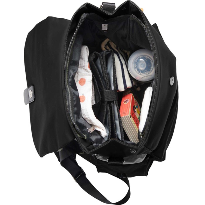 Ryggsäcken har flera olika praktiska fickor och fack, och även plats för datorn. På väskans yttersida finns en smart integrerad ficka för våtservetter, för att snabbt och lätt komma åt servetterna vid behov.