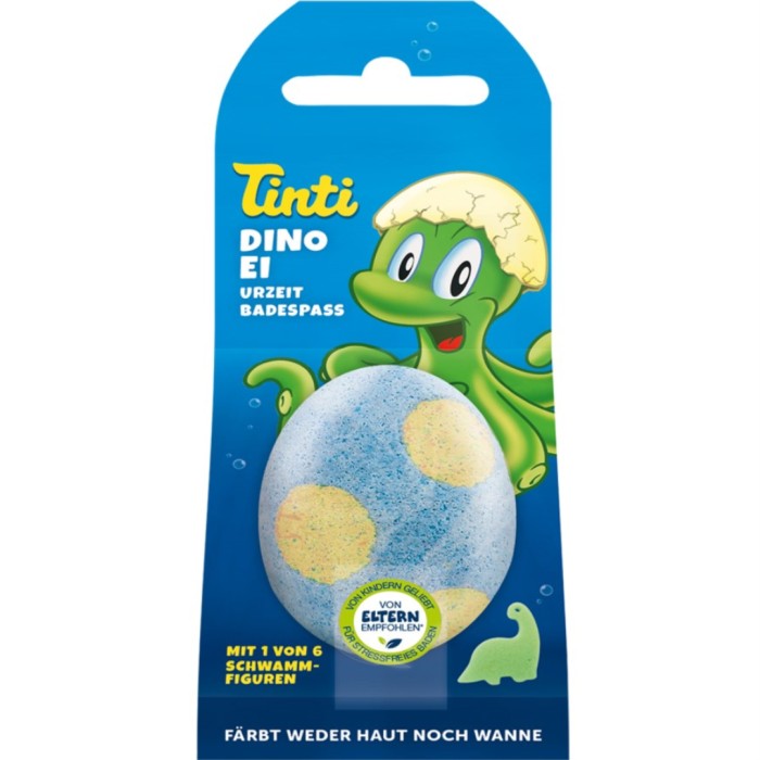 Tinti badägg är kanske en passande present att lägga i julstrumpan eller adventskalendern. Detta dinosaurieägg sprakar och färgar badvattnet blått.