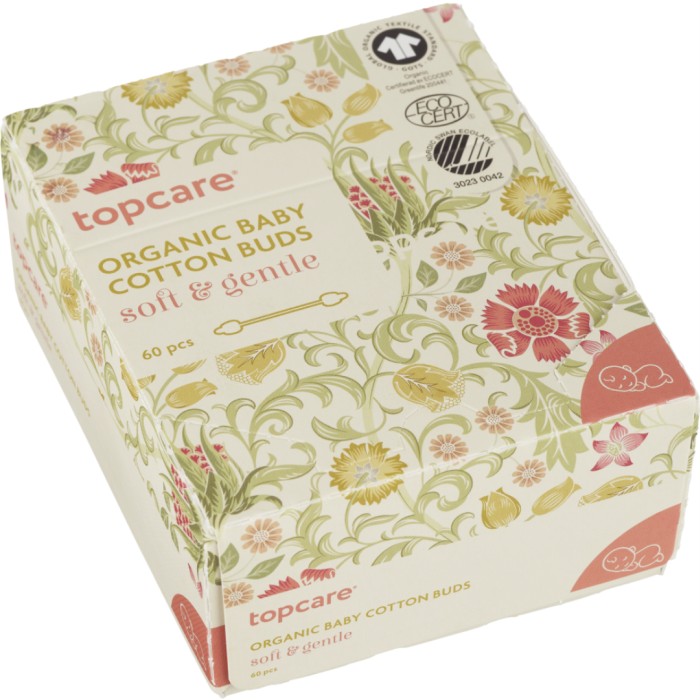 Topcare Cotton Buds Baby är ekologiska bomullspinnar av hög kvalitet som kan användas för rengöring och babyvård. Själva pinnen är tillverkad av FSC-certifierat papper och ändarna är tillverkade av mjuk och GOTS-certifierad ekologisk bomull.