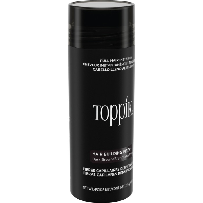 Toppik Large Mörkbrun hårfiber kan användas av både män och kvinnor för att dölja håravfall och ge extra stadga till tunt och fint hår. Innehåller organiskt keratin från naturligt ullhår som fäster i det befintliga håret och gör att det ser tjockare och tätare ut. Hårstråets tjocklek byggs upp vilket gör att håret ser tätare ut, hårbotten syns mindre och håret får mer volym. Applicera Toppik på specifika områden eller i hela hårbotten. Stannar kvar hela dagen.