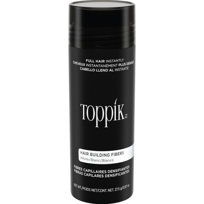 Toppik Large Vit hårfiber kan användas av både män och kvinnor för att dölja håravfall och ge extra stadga till tunt och fint hår. Innehåller organiskt keratin från naturligt ullhår som fäster i det befintliga håret och gör att det ser tjockare och tätare ut. Hårstråets tjocklek byggs upp vilket gör att håret ser tätare ut, hårbotten syns mindre och håret får mer volym. Applicera Toppik på specifika områden eller i hela hårbotten. Stannar kvar hela dagen.