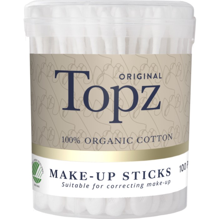 Topz Premium Make-Up Sticks är högkvalitativa bomullspinnar med en topp av 100% ekologisk bomull och med en pinne gjord av papper. Bomullspinnarna är speciellt utformade med en spetsig ände och en platt ände. Den spetsiga änden gör det enkelt att korrigera eller ta bort smink på svåråtkomliga ställen, som vid ögonfransarna. Den platta änden kan användas för applicering av smink, till exempel ögonskugga.