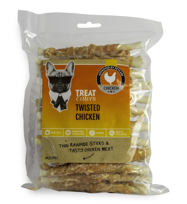 Treateaters Twisted Chicken är "tvistade" tuggpinnar till hund av råhud lindat med torkad kyckling. Ges som belöning eller godis. Genom att tugga kan hundens tänder få en lätt rengöring samtidigt som hunden får en sysselsättning.