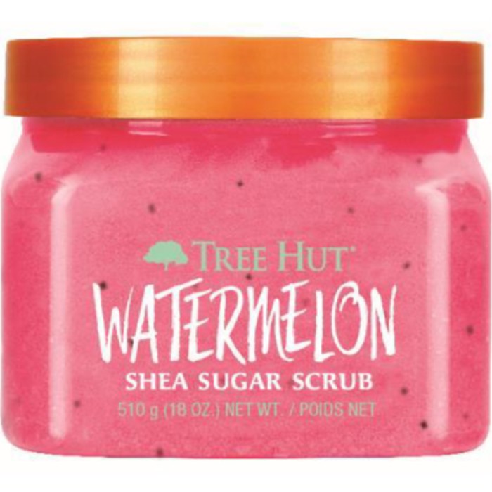 Tree Hut Watermelon Scrub är berikad med vattenmelon som bevarar fukt och ger en skonsam exfoliering, veganskt kollagen som har antiaging-egenskaper och bidrar till fastare och slätare hud samt sheasmör som återfuktar och ger näring till huden och gör huden mjuk. Vegansk.