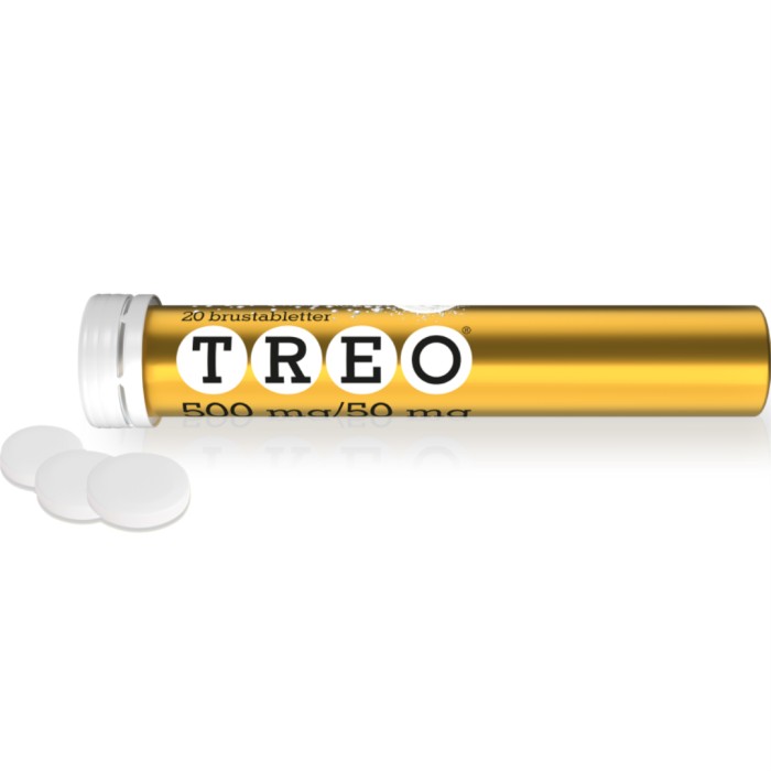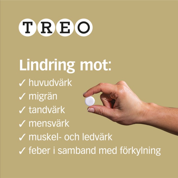 Treo är ett receptfritt läkemedel mot migrän, huvudvärk, tillfällig smärta och feber. Treo brustablett innehåller 500 mg acetylsalicylsyra och 50 mg koffein – en kombination som ger snabb smärtlindring inom 30 minuter. Treo är smärtstillande, febernedsättande och inflammationshämmande och lindrar vid huvudvärk, migrän, mensvärk, tandvärk, muskelvärk, ledvärk och feber.
