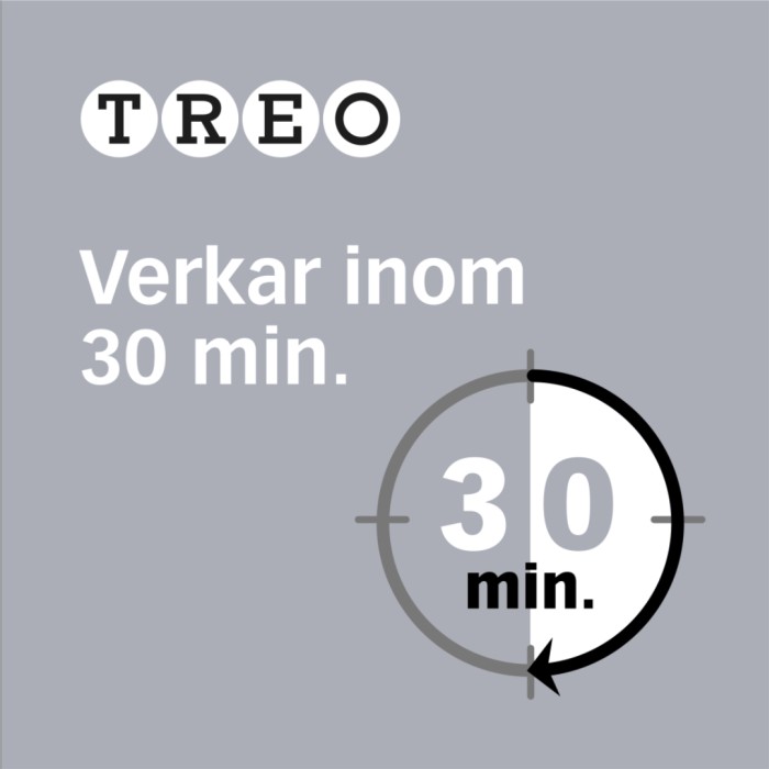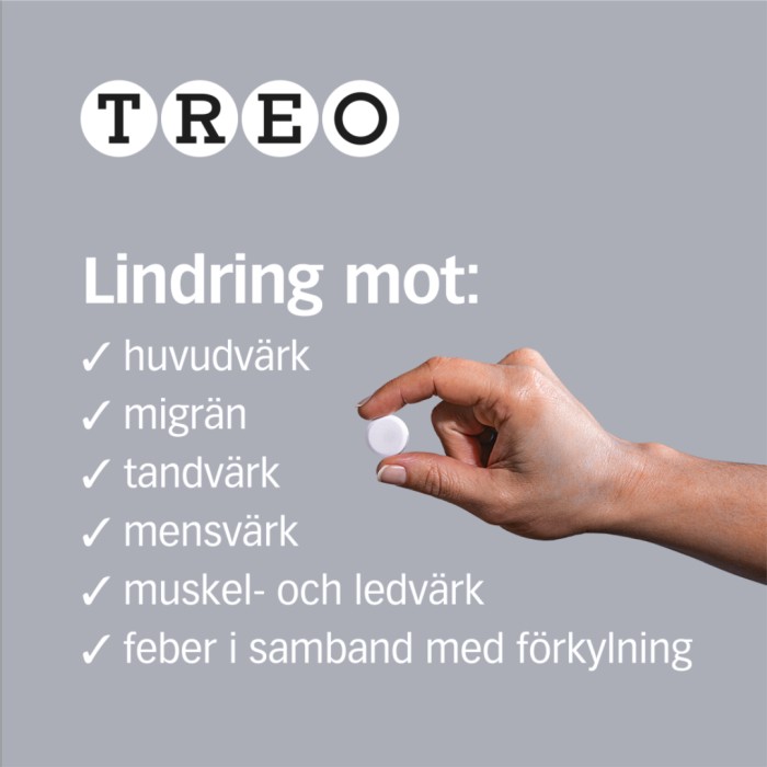 Treo är ett receptfritt läkemedel mot migrän, huvudvärk, tillfällig smärta och feber. Treo brustablett innehåller 500 mg acetylsalicylsyra och 50 mg koffein – en kraftfull kombination som ger snabb smärtlindring inom 30 minuter. Treo är smärtstillande, febernedsättande och inflammationshämmande och lindrar vid huvudvärk, migrän, mensvärk, tandvärk, muskelvärk, ledvärk och feber.