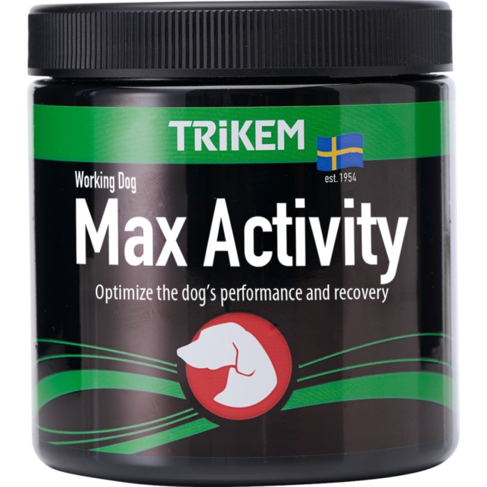 Trikem Working Dog Max Activity är fodertillskott för aktiva hundar i alla åldrar. Working Dog Max Activity innehåller näringsämnen som kan stötta muskler, återhämtning, uthållighet och välmående. Ges som dagligt tillskott till den aktiva och arbetande hunden. Kan även ges som extra tillskott inför och under perioder med krävande arbete t.ex. under jaktsäsongen eller längre tävlingsperioder.