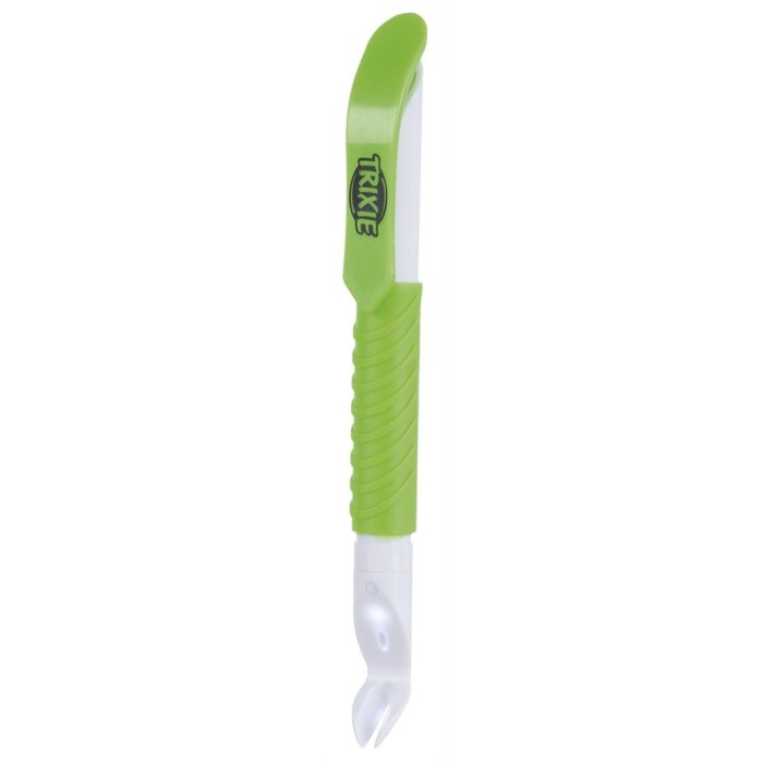 Trixies fästingplockare med inbyggd LED-lampa gör det lättare att plocka ur fästingarna ur djurets päls. Plockaren är utformad som en penna och är bekväm att hålla i.