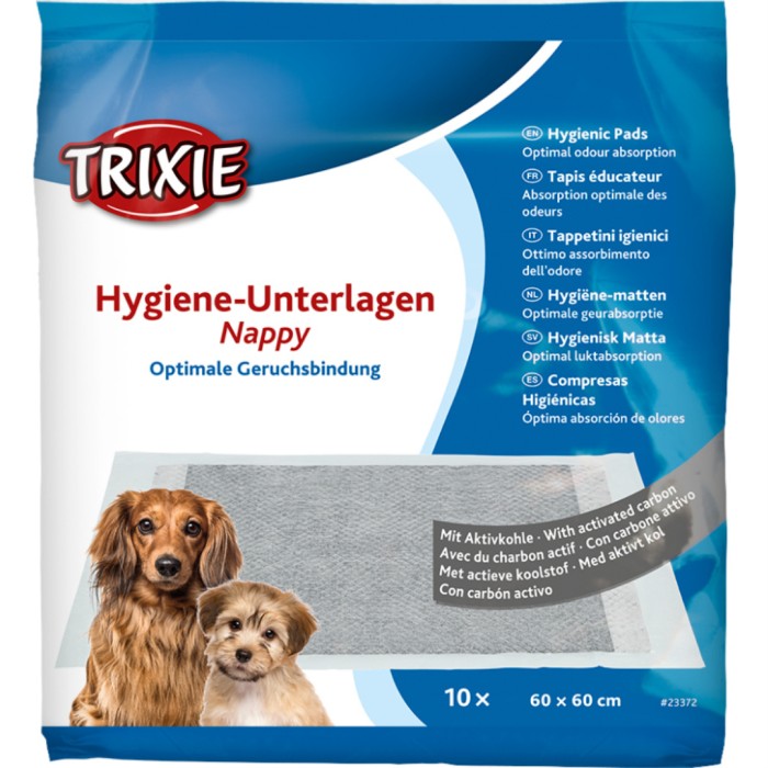 Trixie Housetrainer valpmatta med aktivt kol 60 x 60 cm. Dessa hygieninlägg med aktivt kol ger optimal luktabsorption och hjälper din valp under rumsrenhetsträningen. Valpmattorna är utformade för att minimera oönskade lukter och kan även användas i hundbädden för inkontinenta hundar. Den förseglade kanten förhindrar att fukt läcker ut, vilket säkerställer en ren och fräsch miljö. Tillverkade av långfibrig cellulosa för extra absorptionsförmåga.