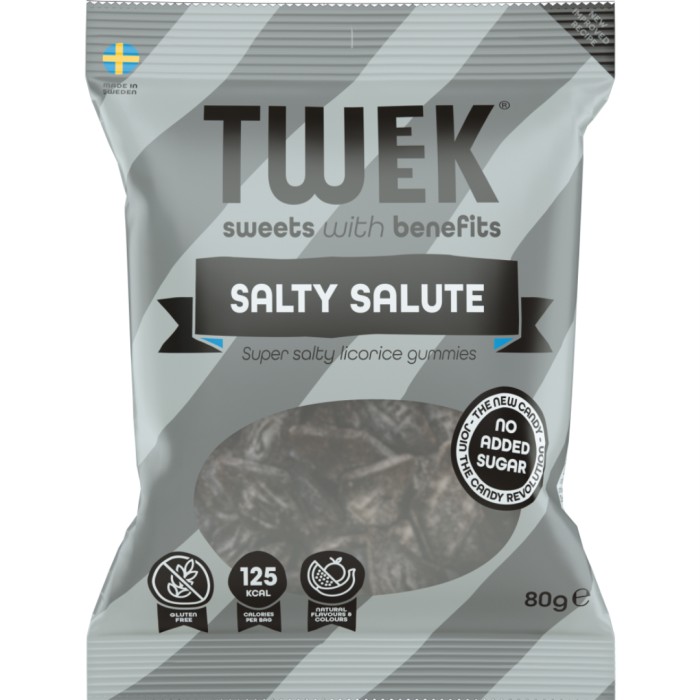 Tweek Salty Salute är salmiaksaltat gelégodis, en sort som länge varit en toppsäljare i Tweeks "Pick & Mix-sortiment".