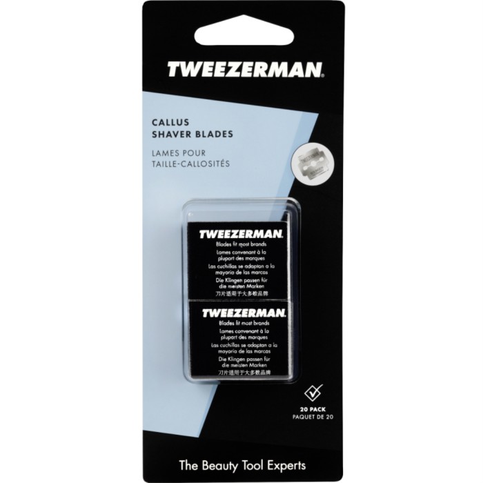Tweezerman Callus Shaver Blades är rakblad som passar till Tweezerman Callus Shaver. De högkvalitativa, dubbelsidiga ersättningsbladen passar alla Callus Shavers. Bladen är tillverkade av laminerat stål som inte rostar.