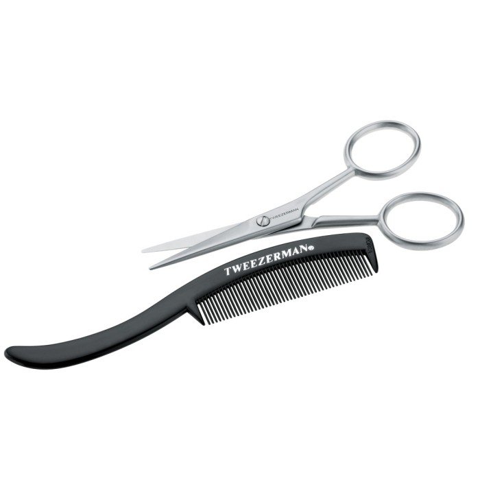 Tweezerman Moustache Scissors är en sax med skarpa och raka blad i rostfritt stål som används för att trimma mustasch, skägg och ögonbryn.