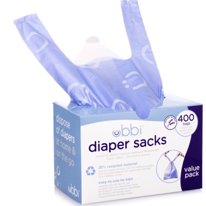 UBBI Diaper Bags blöjpåsar med lavendeldoft är tillverkade av 20% återvunnet material. Påsarna har enkla knytband för att vara smidiga att hantera, och kan användas både hemma och när ni är på språng. Påsarna har en doft av lavendel för att dölja obehaglig lukt. Påsens mått: 19 x 9 x 11,5 cm.