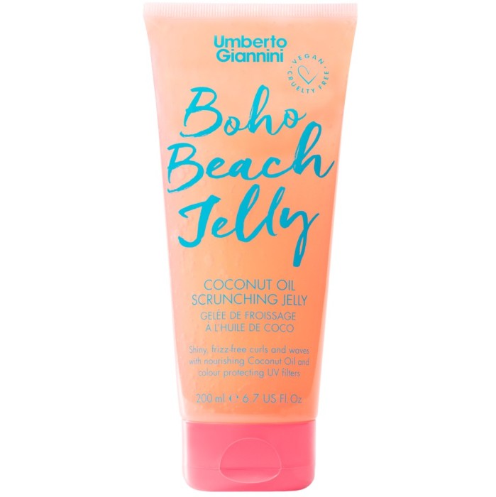 Boho Beach Coconut Oil Scrunching Jelly är en lätt formgivande gel som förhindrar frissighet och ger ett mjukt och naturligt strandhår. Umberto Giannini Scrunching Jelly innehåller kokosolja som ger näring och UV-filter som skyddar håret och motverkar att hårfärgen bleknar. Gelen ger håret glänsande vågor och lockar utan den krispiga, torra känslan av saltvatten.