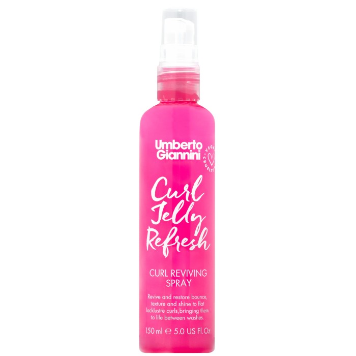 Curl Jelly Refresh Curl Reviving Spray från Umberto Giannini är en hårspray som återupplivar och återställer platta och tråkiga lockar, och gör dem studsiga och glänsande. Sprayen har en anti-frissighets-formuleing med näringsrik ricinolja och lavendelolja som motverkar frissighet och ger glans till håret. Gör att lockarna återaktiveras och blir mer definierade med ny spänst. Kan användas mellan hårtvättar för en uppfriskande känsla. Sulfatfri och silikonfri. Vegansk.