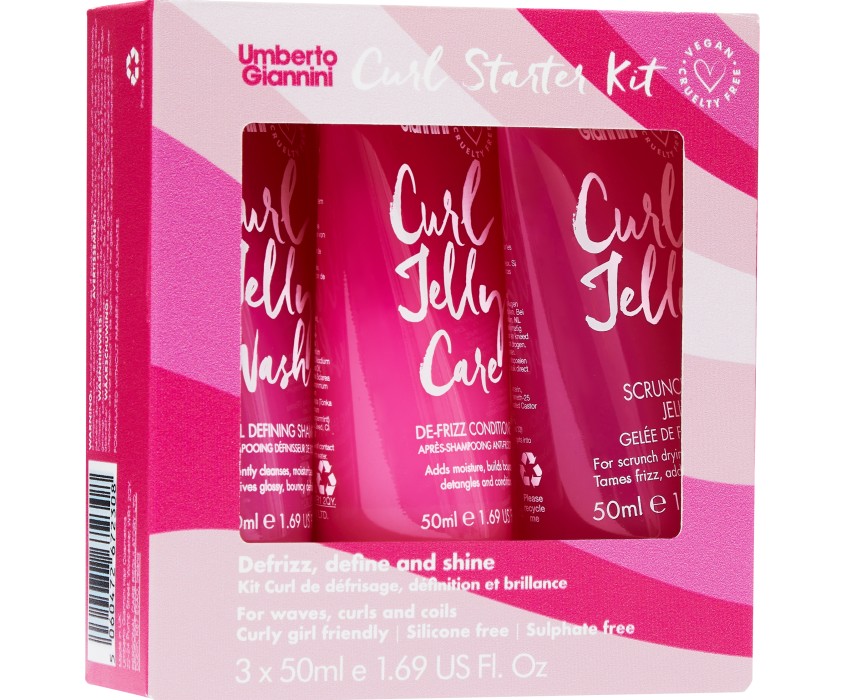Umberto Giannini Curl Starter Kit Defrizz, Define & Shine är ett kit med 3 hårprodukter á 50 ml för lockigt hår - ett startkit med de tre bästsäljande produkterna från Curl Jelly-serien: Curl Jelly schampo, Curl Jelly Care Conditioner och Curl Jelly Scrunching Jelly.