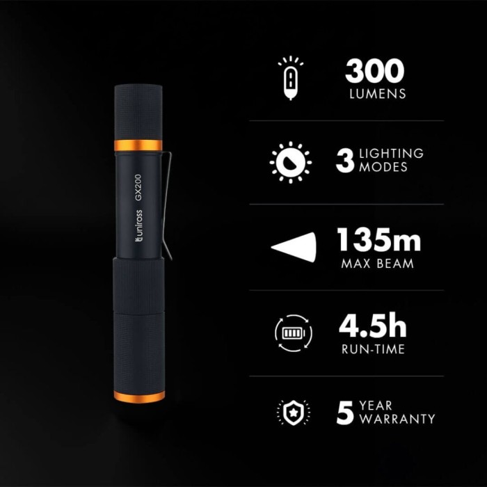 GX200 är en ficklampa i Uniross ficklamps-serie Pro. Denna ficklampa är laddbar och helt i aluminium. Den är utrustad med ett praktiskt bältesklipp för att du enkelt ska kunna ta med den överallt. Ficklampan har ett klart, krispigt vitt sken på 300 lumen. Den går att ställa i tre olika ljuslägen: High, Low och SOS. Den lyser i cirka 4,5 timmar efter en uppladdning.