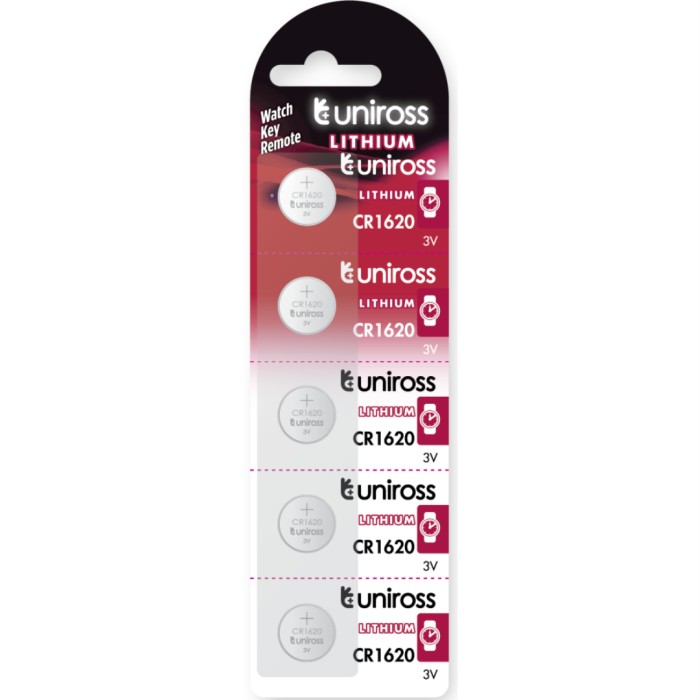 Uniross Lithium CR1620 3V är knappcellsbatteri för elektronisk utrustning och leksaker. 5-pack.