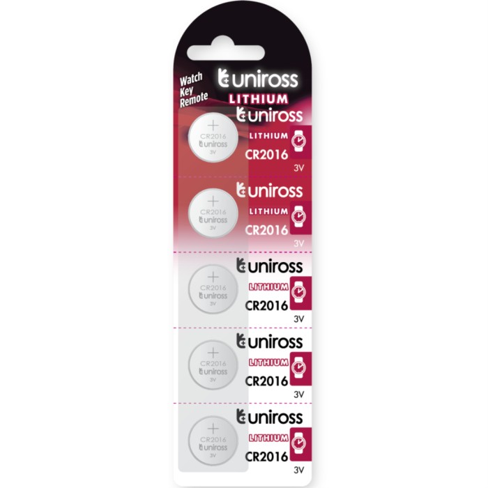Uniross Lithium CR2016 3V knappcellsbatteri för elektronisk utrustning och leksaker. 5-pack.