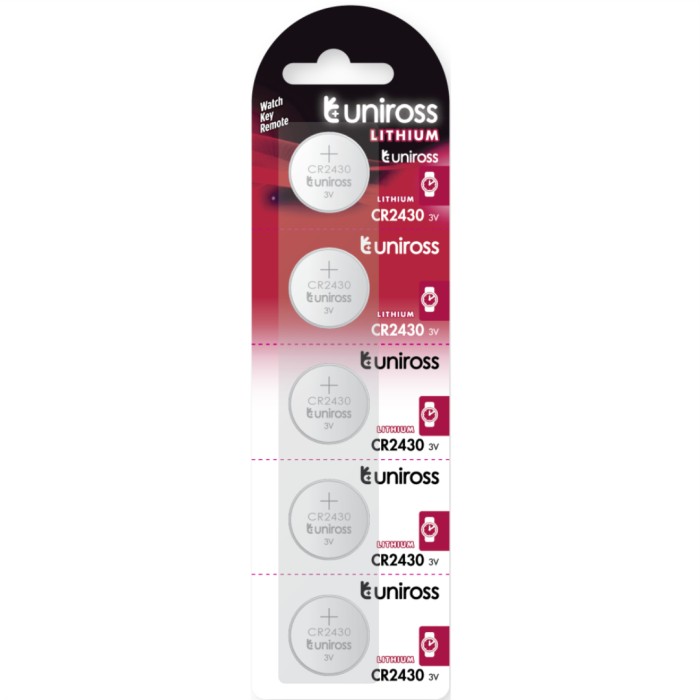 Uniross Lithium CR2430 3V knappcellsbatteri för elektronisk utrustning och leksaker. 5-pack.
