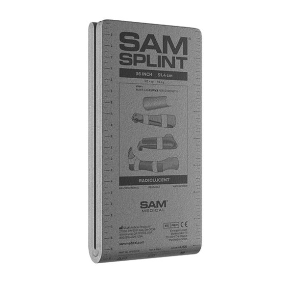 SAM Splint är ett snabbt och effektivt stödförband. Är enkelt och smidigt att ha med sig och att använda. SAM Splint är byggd med en tunn kärna av aluminium, inbäddad mellan två lager av slutna skumceller. Mycket smidig, och vinklad i någon av de tre enkla kurvorna blir den extremt stark och stödjande.