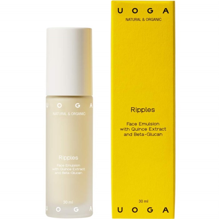 Uoga Uoga Ripples Moisturising Face Emulsion with Quince Extract for Normal and Dry Skin är en lättflytande emulsion för ansiktet. Den lätta emulsionen är berikad med fuktgivande aktiva ingredienser och kan användas som ett alternativ när du vill återfukta huden men vill undvika mycket oljor.
