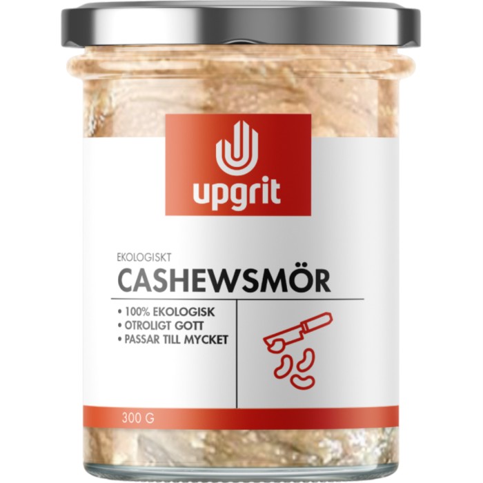 Upgrits ekologiska cashewsmör är gjort på 100 % ekologiska cashewnötter, utan andra tillsatser. Cashewsmöret är mjukt i konsistensen och kan användas på kex, bröd, som mellanmål eller till bakning. Nötterna är rostade och inte raw.
