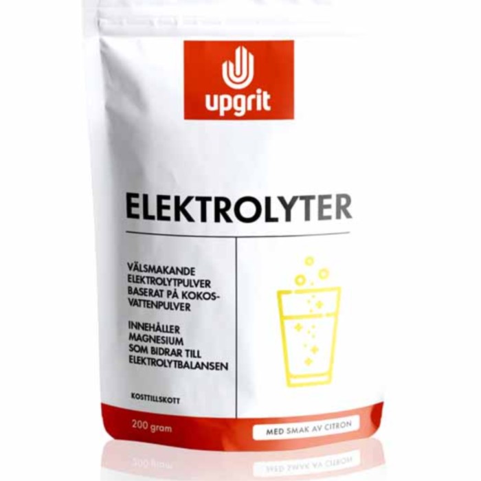 Upgrit Elektrolyter Citron är ett pulver med en blandning av mineraler och C-vitamin, baserat på kokosvattenpulver. Upgrit Elektrolyter innehåller citronjuicepulver, himalayasalt, citronarom, acerolajuicepulver och sötningsmedel.