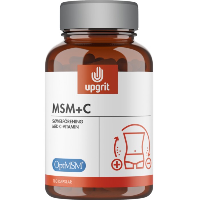 Upgrit kosttillskott med MSM och C-vitamin. MSM (metylsulfonylmetan) är en organisk svavelförening som finns naturligt i kroppen och är en beståndsdel i kollagen, det protein som bygger upp bindväv, muskler, skelett, hår och hud. C-vitamin bidrar till normal kollagenbildning som har betydelse för broskets och hudens normala funktion.